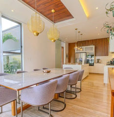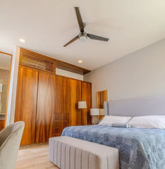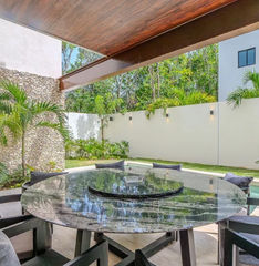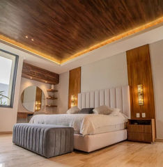 La casa tiene un terreno de 351m2 con 13m de frente y 27m de lados. La normativa de construcción en Valenia mantiene las casas en el centro del lote, lo que deja espacio para amplias banquetas, cochera y un enorme patio trasero. En la planta baja de la casa, encontrarás la cocina con equipos modernos y un sofisticado filtro de agua. También el comedor con vista al jardín y la piscina. Hay una despensa para víveres, un cuarto para herramientas y una recámara con baño propio. En el otro lado de la casa se encuentra la elegante sala de estar y el bar, el corazón de la casa. Hay arte en las paredes, el televisor y un sistema de sonido. Esta área tiene una puerta de vidrio de piso a techo que conecta con la terraza y la piscina. En el segundo piso encontrarás la recámara principal con un vestidor y un baño amplio con espejo de lado a lado. Las otras 2 recámaras tienen su propio baño y están separadas por el cuarto de lavado. Toda la madera de la propiedad es parota, mientras que el piso es de mármol y la cocina tiene una isla y una encimera de cuarzo. La casa cuenta con muchas ventanas que proporcionan luz natural y ventilación las 24 horas, los 7 días de la semana. La propiedad presume un estilo arquitectónico contemporáneo con acabados de alta gama y atención al detalle. Al salir, te encontrarás con un hermoso jardín paisajístico con una piscina privada y un área de entretenimiento. Perfecto para relajarte o hacer reuniones, el espacio exterior incluye un patio cubierto, área de BBQ y amplio espacio para descansar al sol.